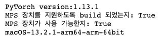 print(f"MPS 장치가 사용 가능한지 확인: {torch.backends.mps.is_available()}") # True